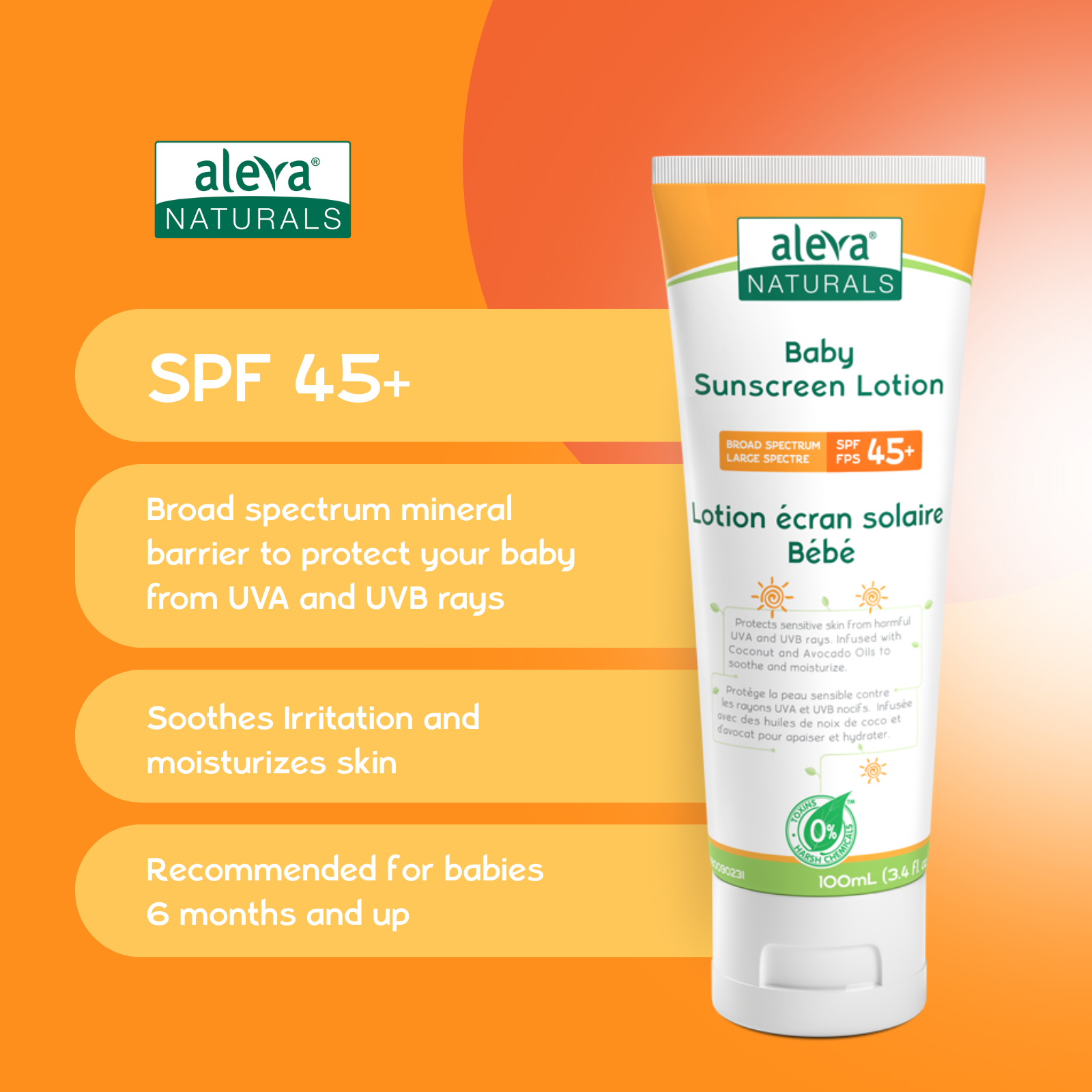 Protect your baby's skin from the sun with Aleva Naturals Baby Sunscreen Lotion SPF 45+. Enriched with Natural Jojoba, Organic Coconut and Organic Avocado Oils that simultaneously moisturize to soothe skin; while the 25% zinc provides a protective barrier from the UVA and UVB rays. This unique formula can be used on baby's face & body. This sunscreen lotion is hypoallergenic, free of parabens, phthalates, sulfates, and dyes. Like all Aleva Naturals products, the Baby Sunscreen Lotion SPF 45+ is made with premium quality ingredients, so you can enjoy a safe product without harsh chemicals or additives. Formulated for babies 6 months & up!