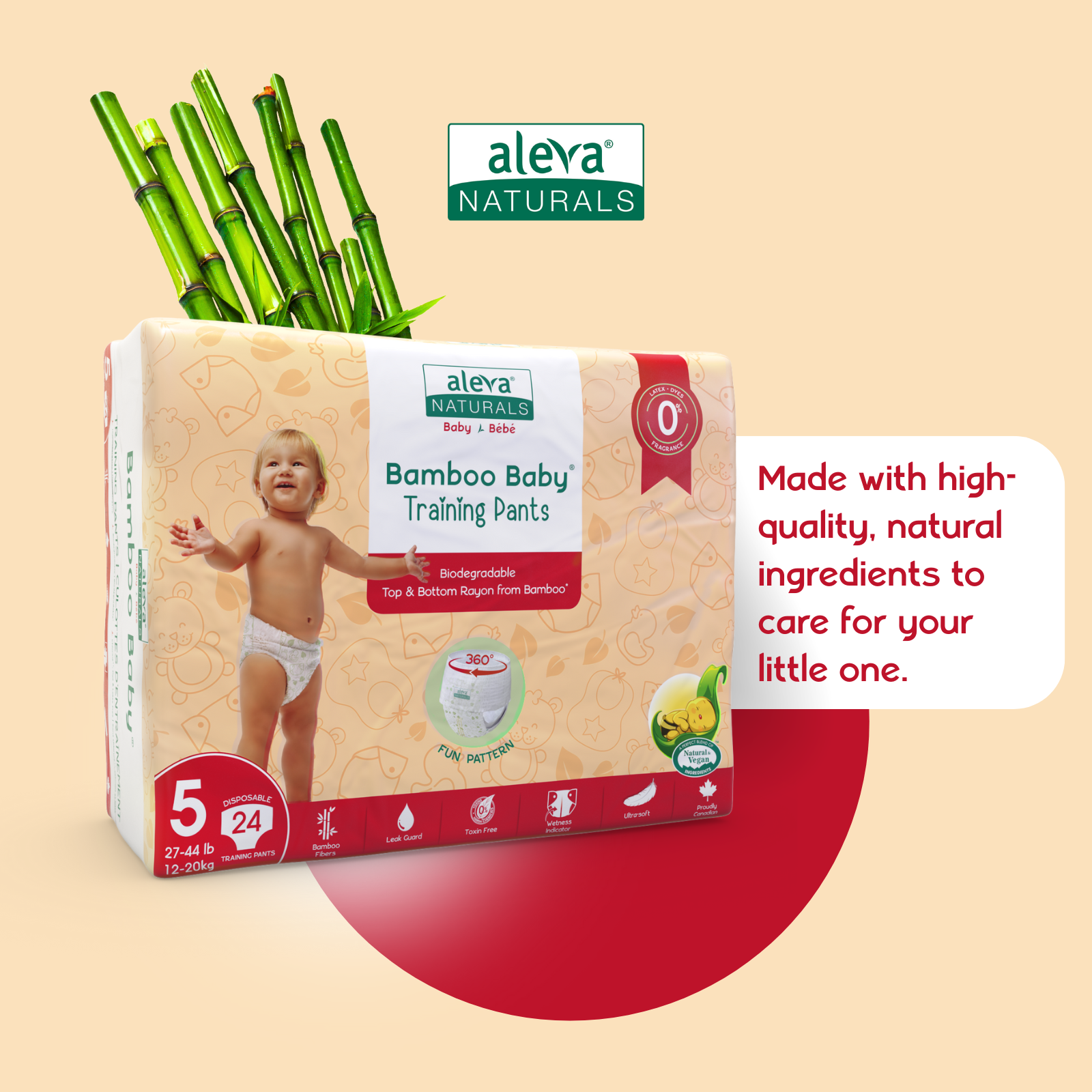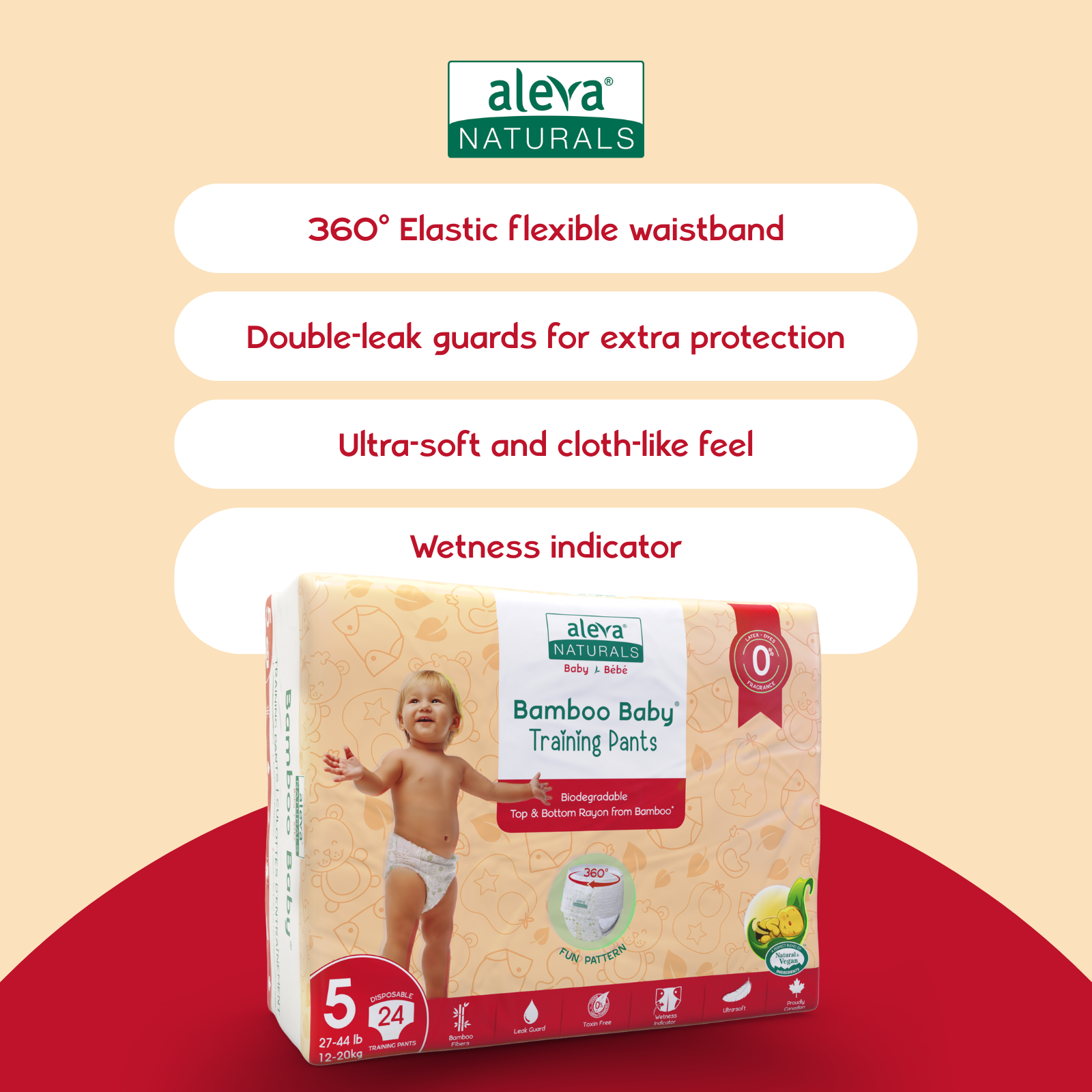 Make potty training simple and comfortable with Aleva Naturals Bamboo Baby Training Pants. Designed for little ones learning to pull up and down on their own, these training pants feature a 360° flexible elastic waistband for an easy, underwear-like fit. Crafted from ultra-soft, breathable bamboo fibres, they’re 0% latex, perfume free, and gentle on delicate skin. The extra-absorbent core, double-leak guards, and breathable back layer help keep your child dry and comfortable, while the 3-line wetness indicator changes from yellow to green to signal when it’s time for a change. Feathery soft, durable, and biodegradable, Aleva Naturals Training Pants are the perfect balance between diapers and big-kid underwear. Like all Aleva Naturals products, they’re made with premium plant-based materials, free from harsh chemicals or additives, so your little one stays comfortable, confident, and eco-friendly every step of the way.