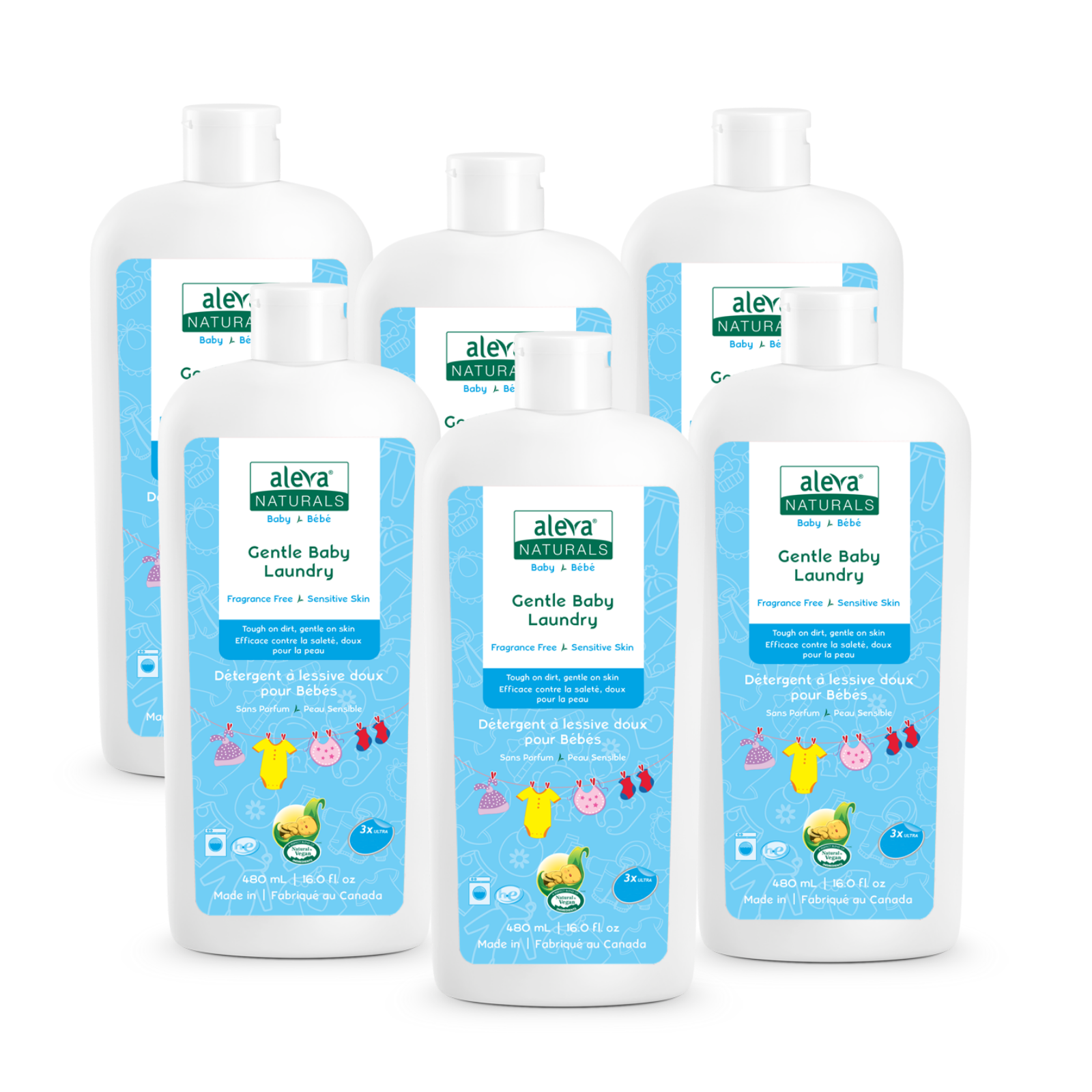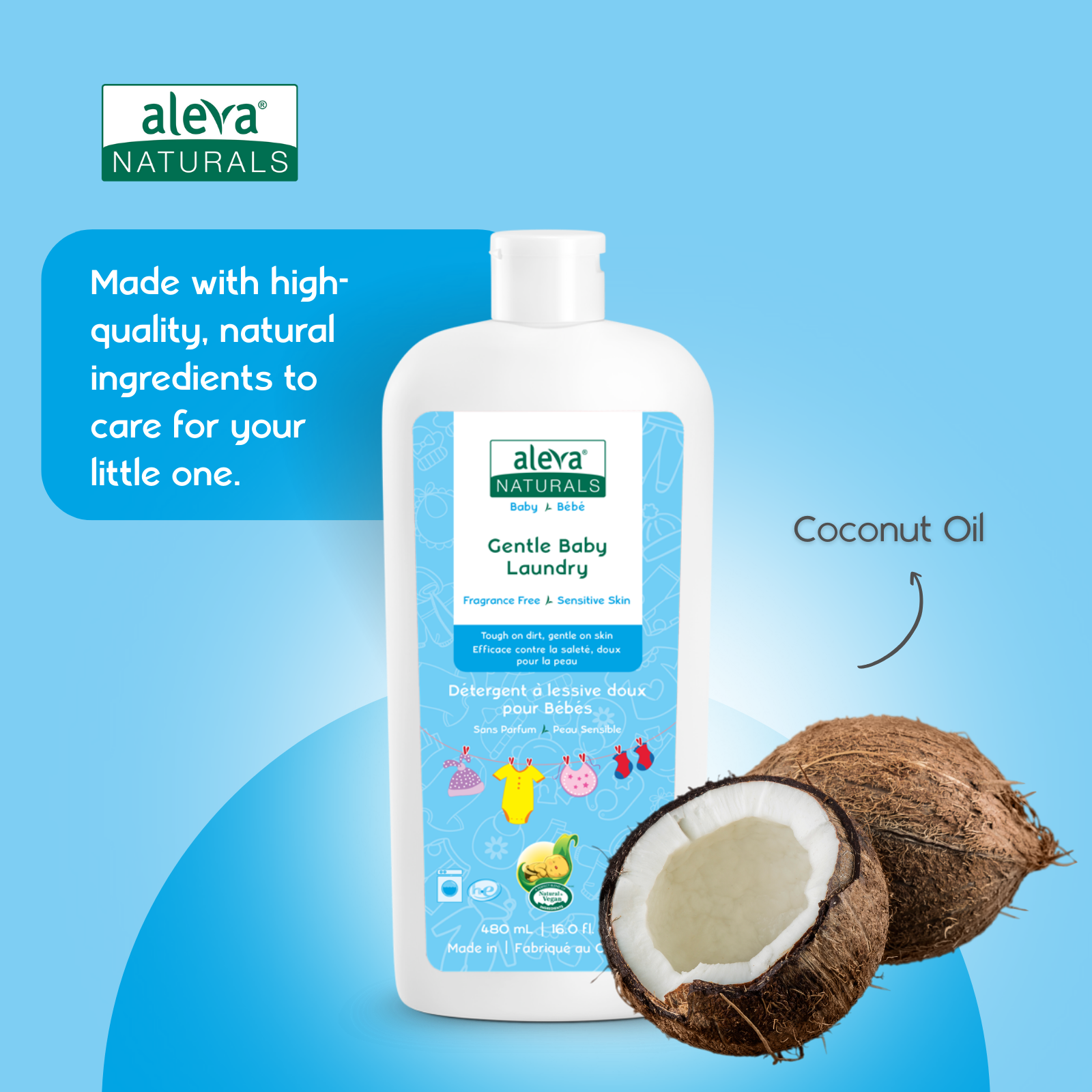 Gently wash baby's clothes with the Aleva Naturals Gentle Baby Laundry. Enriched with a unique blend of emulsifiers and cleansers derived from coconut oil, this detergent helps penetrate clothing & fabrics to remove stains and odours for a pure and powerful clean. This 3X concentrated formula rinses thoroughly, leaving your baby’s clothes feeling naturally soft and smelling fresh, it actually gets the job done, Plus, this plant based formula is gentle on your baby's delicate & sensitive skin. This laundry detergent is hypoallergenic, free of SLS/SLES & Dioxane. Like all Aleva Naturals products, the Gentle Baby Laundry is made with  premium quality ingredients, so you can enjoy a safe product without harsh chemicals or additives. Formulated for babies, suitable for the entire family.